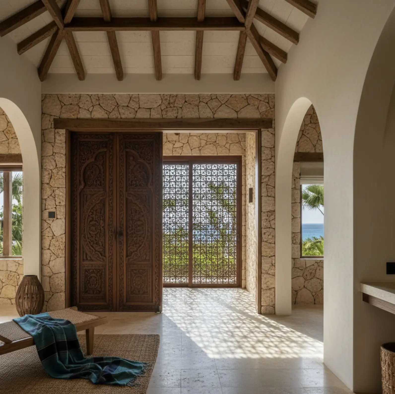 تلعب المواد الطبيعية دورًا أساسيًا في تشكيل التجربة، حيث تضيف الأسقف الخشبية المكشوفة، والأبواب المنحوتة، والعناصر الحرفية طابعًا من الأصالة والعمق. كما يعزز استخدام الألوان الحيادية مع الإضاءة الهادئة إحساس الراحة والاسترخاء داخل المساحات.