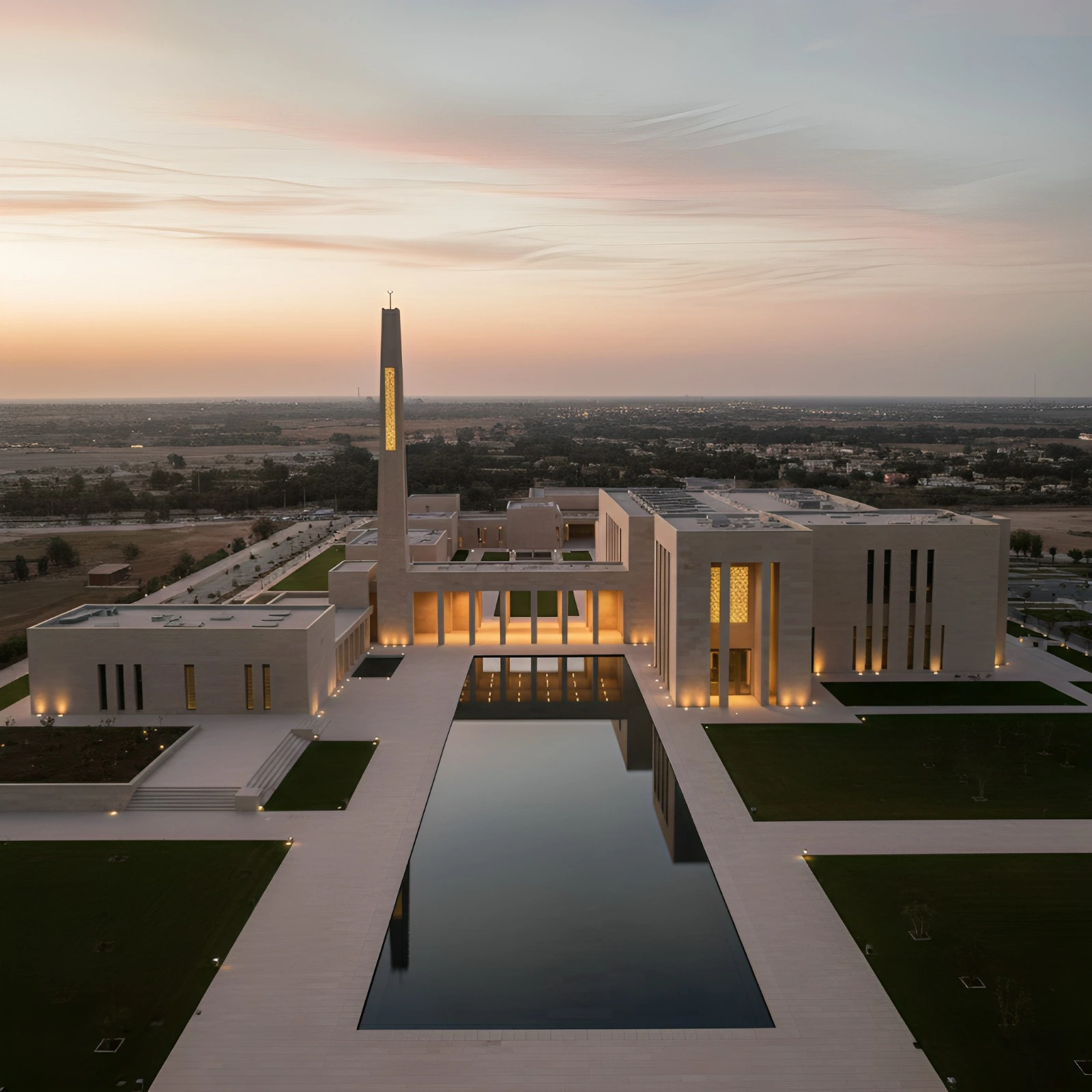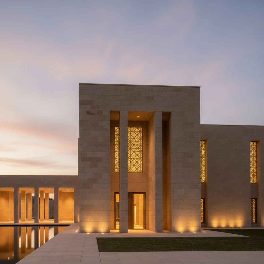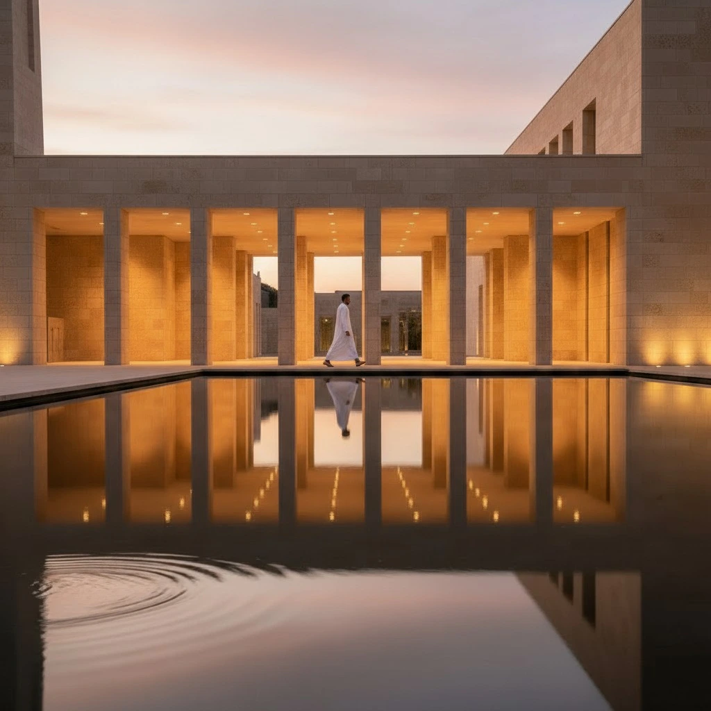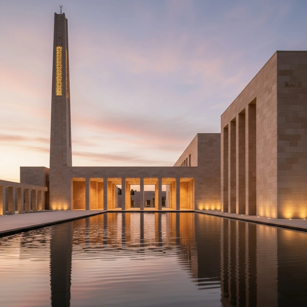 Water features are integrated along the main axis, reflecting the architecture and adding a calm, spiritual atmosphere to the space. The building’s form is defined by simple volumes, clean lines, and carefully designed openings that allow natural light to enhance the interior experience.
