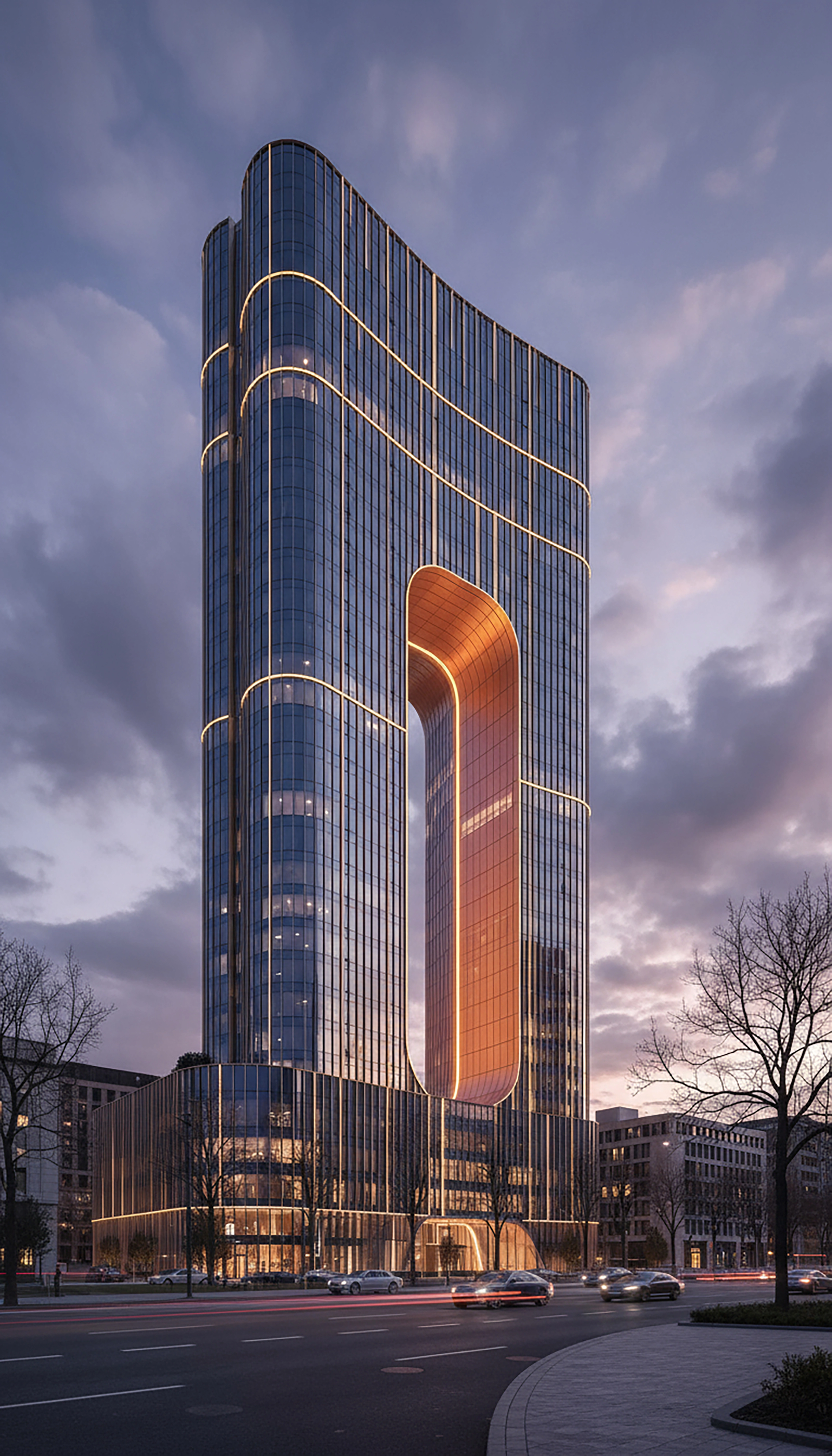 The tower’s form is carefully articulated with smooth curves and continuous lines, allowing the building to stand out while still blending harmoniously with its surroundings. The interplay between transparency and solidity creates a dynamic façade that changes appearance throughout the day, responding to light, reflections, and perspective.