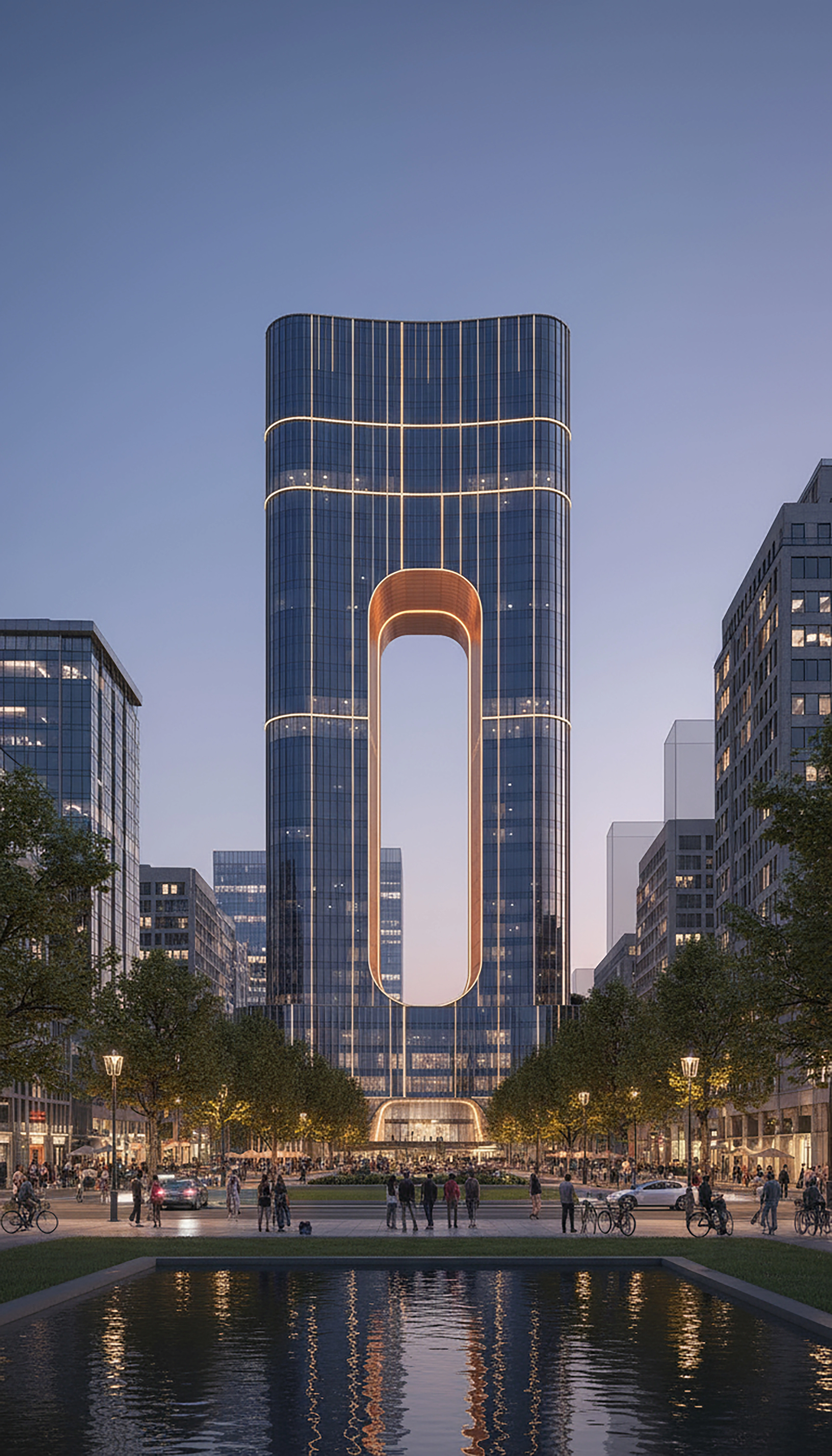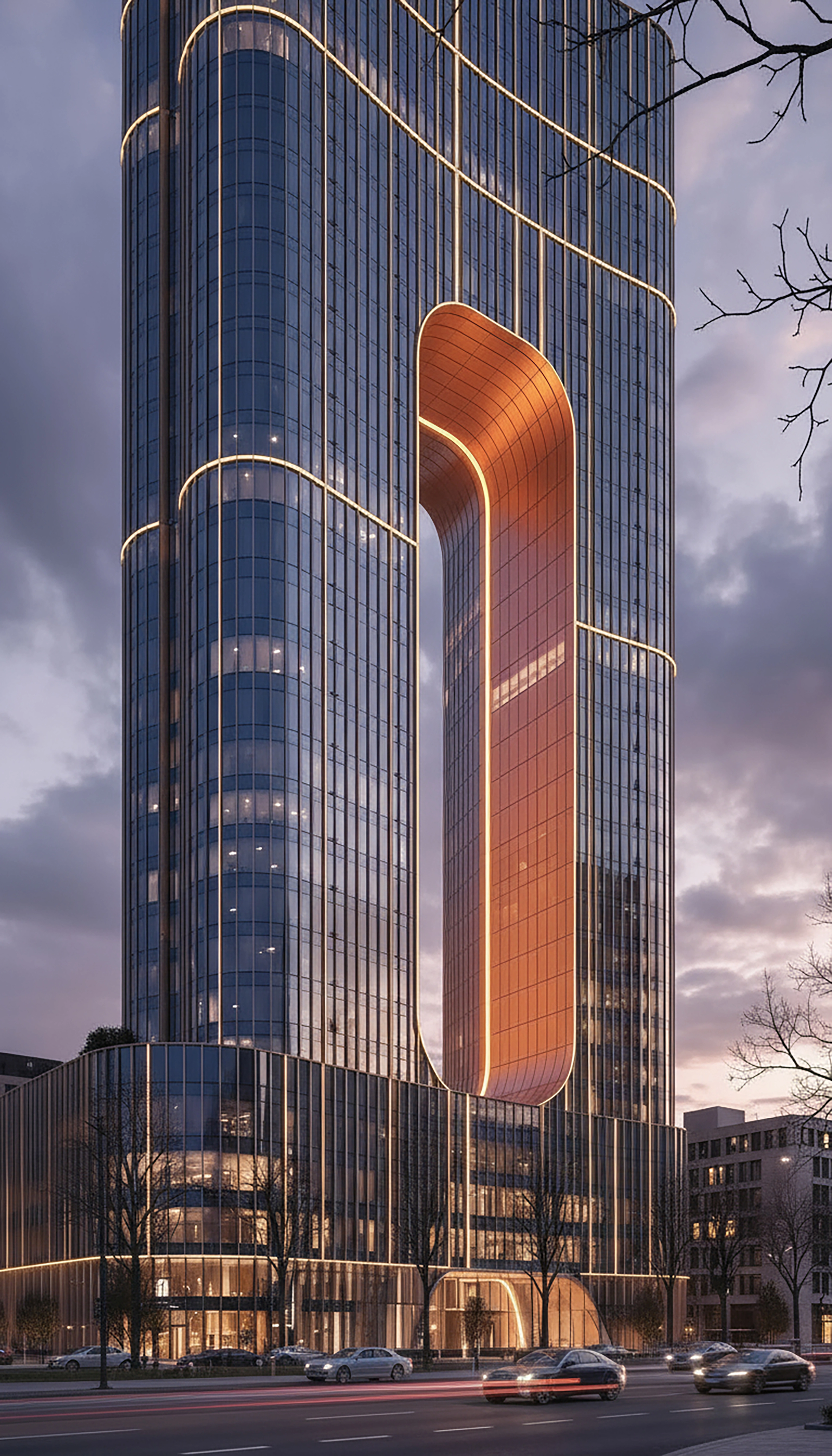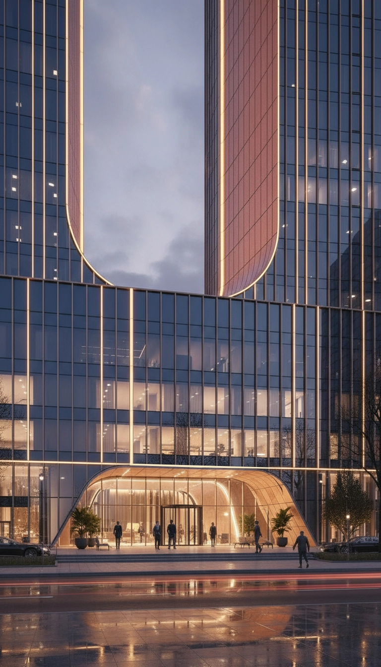 At the heart of the design lies a distinctive architectural void that cuts through the mass of the building, creating a bold and memorable identity. This sculptural element is further enhanced by warm integrated lighting, forming a striking contrast against the cool glass exterior. The feature not only serves as a visual landmark but also introduces a sense of depth, openness, and movement within the overall composition.